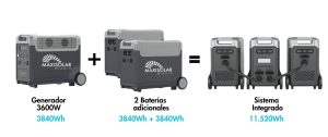 El Pack Maxi Full 11.520W es la solución energética más completa y potente de la línea Maxisolar. Diseñado para usuarios que necesitan máxima autonomía, potencia continua y operación prolongada, este pack combina un generador portátil de 3600W, dos baterías adicionales de 3840Wh cada una y cuatro paneles solares plegables de 200W, alcanzando un sistema total de 800W de carga solar. Compatible con paneles solares plegables y fijos.